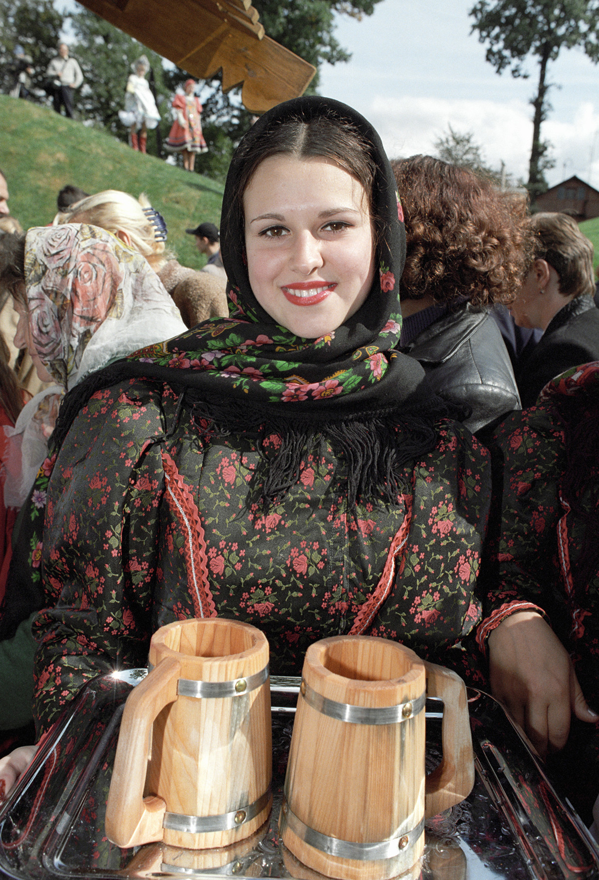 Обърни внимание как е вързана кърпата на тази руска красавица – краищата са прибрани в прилежно направен възел отгоре на главата и са вдигнати нагоре. И самият възел изглежда като цветни листенца. Така са носели кърпите си представителките на това съсловие и затова този начин се нарича „търговски“.