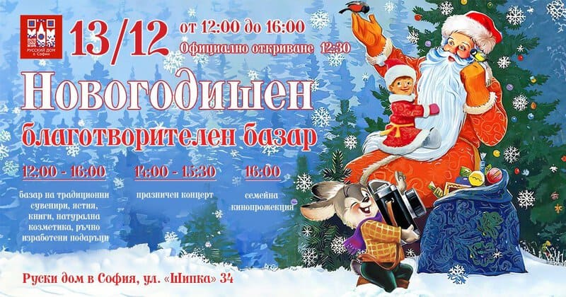 Имаме удоволствието да ви поканим на нашия традиционен новогодишен благотворителен базар в Руския дом в София, който ще се проведе на 13 декември от 12:00 до 16:00 часа.