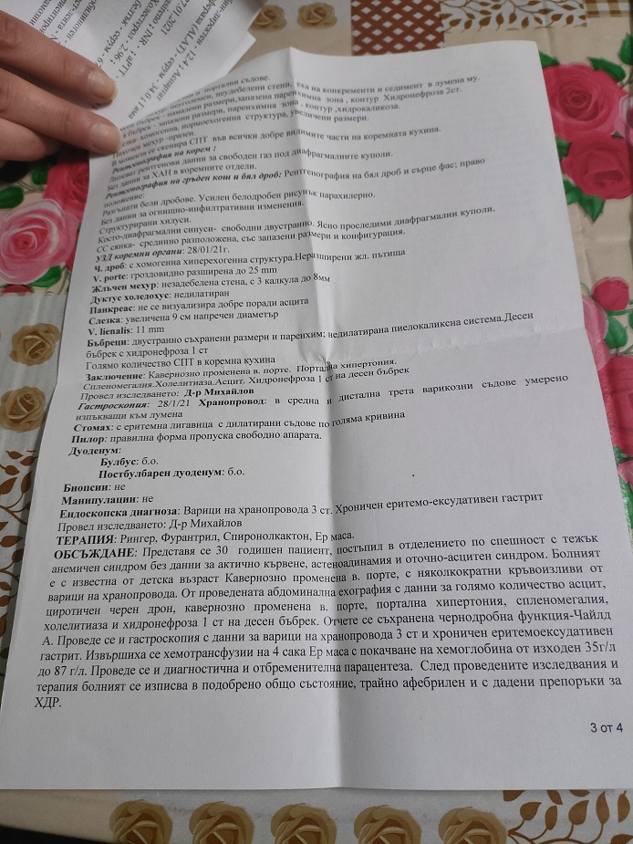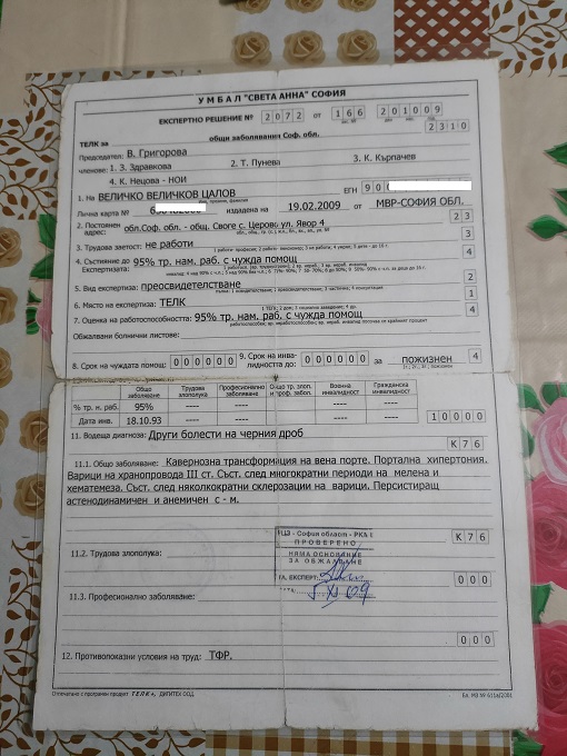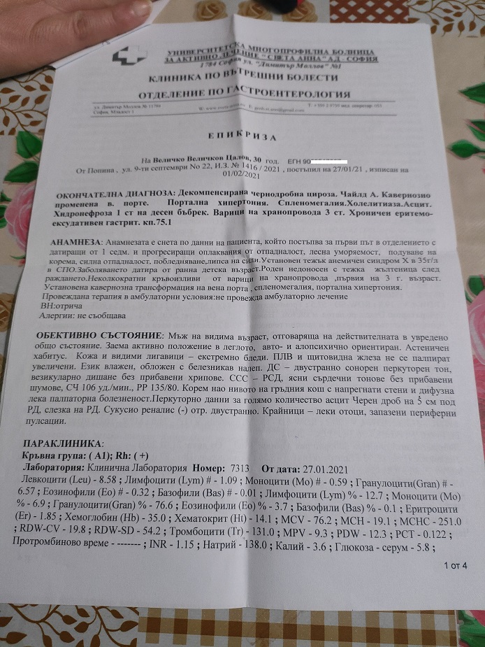 „Пише ви един млад мъж на 31г. Аз съм с ТЕЛК 95%, защото съм с увеличен черен дроб и далак и по миналата година ми откриха “Декомпенсирана цероза на черен дроб“. Изписаха ми лекарства, които в началото можех да си позволявам, но с напредването на времето и на болестта тези лекарства се увеличиха, а са животоподържащи за мен и не мога да си ги позволя, тъй като и пенсията която държавата ми дава е малка. Обръщам се към вас с идеята, ако можете да ми помогнете да събера пари, за да си купя лекарствата.
