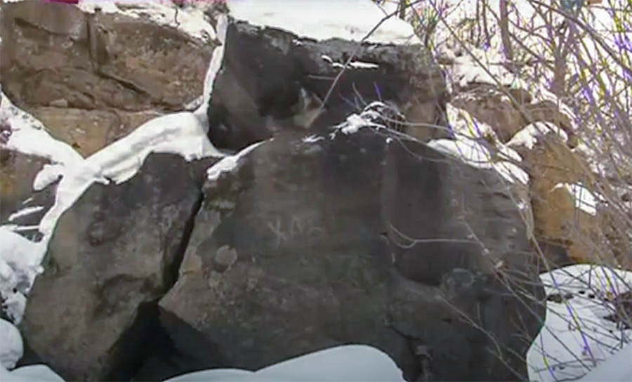 Академик Алексей Окладников и кандидат на историческите науки Александър Конопацки изследват петроглифите на скалата. Археологически разкопки в село Сикачи-Алян.Dvernick/Sputnik