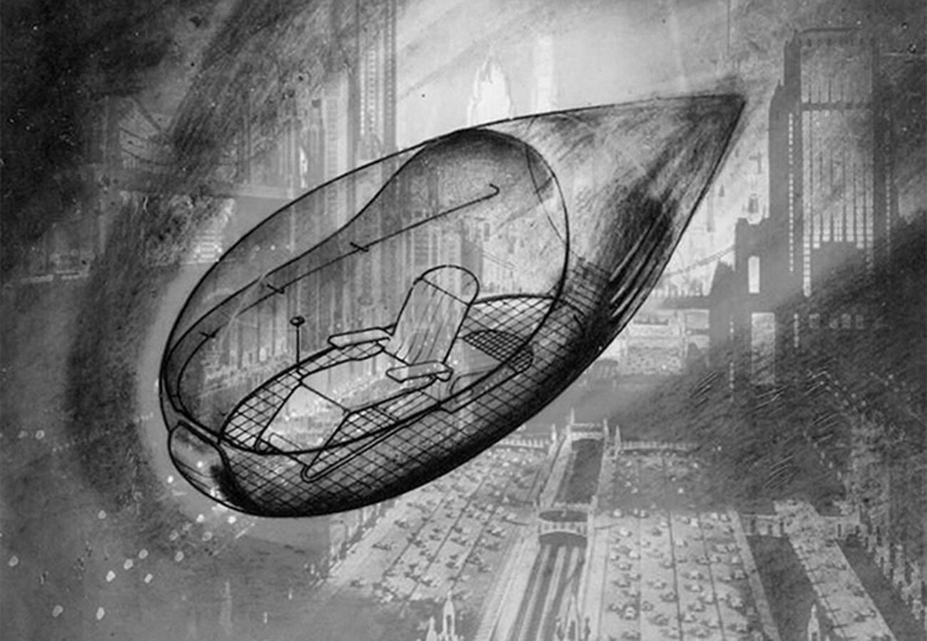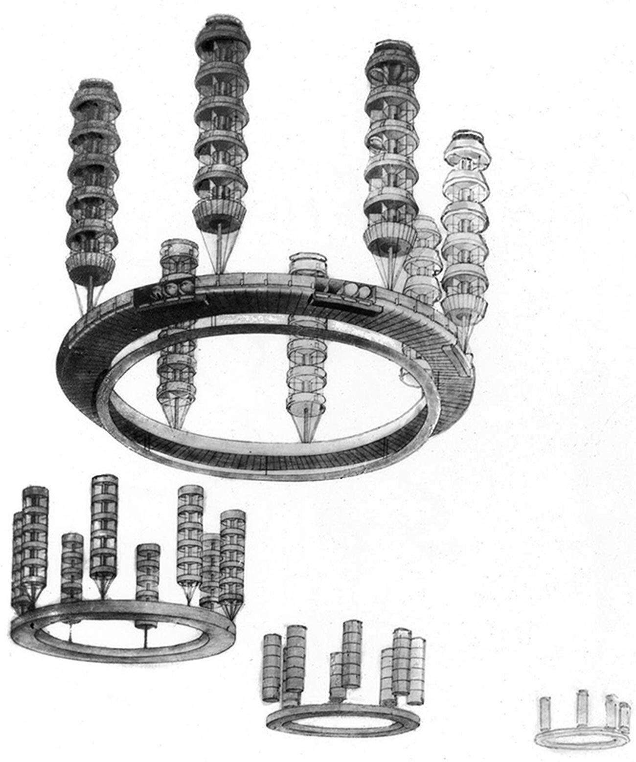 Архитектът предлага земята да се освободи, като на повърхността бъдат оставени само заводите и останалите производствени мощности, а хората да бъдат преместени да живеят за постоянно в комунални градове, носещи се във въздуха.